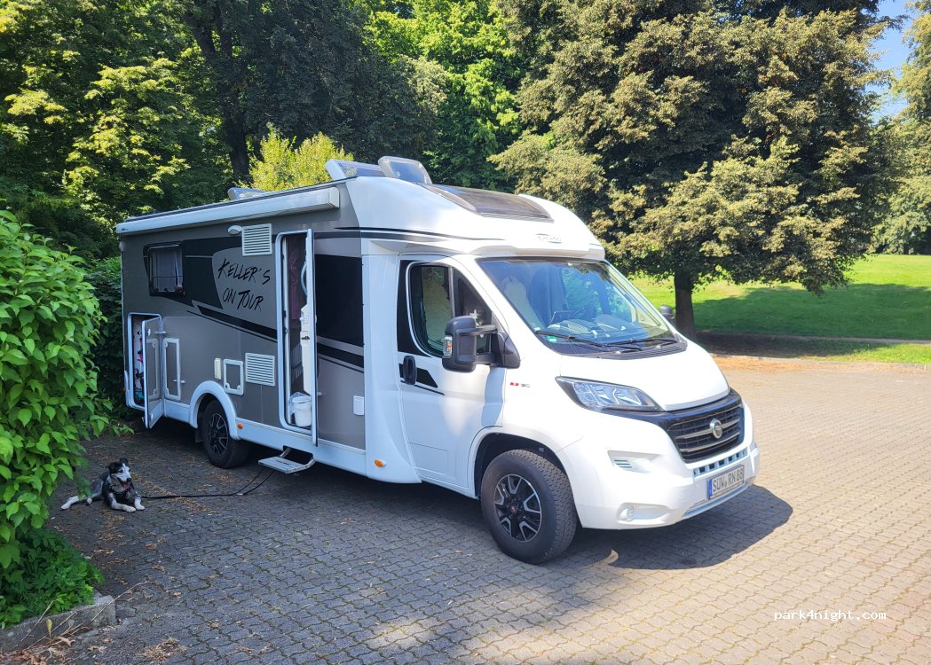 Parkplatz hinter der Kirche, direkt unterhalb des Schlosses. Keine Verbotsschilder. Drei Wohnmobile waren hier. Schöne Aussicht und viel Ruhe.