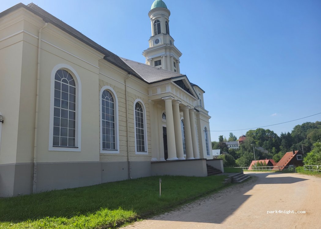 Schöner Parkplatz hinter einer Kirche. Aktuell eine Baustelle.Allerdings kein Baulärm.Man kann das Örtchen besuchen oder einfach nur Übernachten.Es gibt weder Strom, Wasser und auch keine Müllbehälter. V/E auch nicht. Die Plätze sind einfache Parkplätze ohne Verbot.Fahrzeuge bis 8 m gehen noch,da man den Überhang über die Rasen Kante fahren kann.Die Plätze sind aufgeschottert.