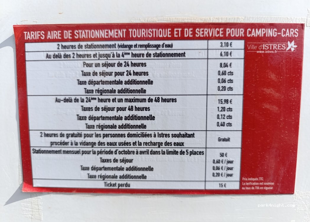Le prix est passé à 3,1€ pour 2h de stationnement et services : vidanges eaux grises et noires et remplissage d'eau fraîche gratuit. La moitié du stationnement est à l'ombre, au bord de l'étang. C'est largement suffisant pour dépanner de quelques heures ou d'une nuit pour un prix modique !