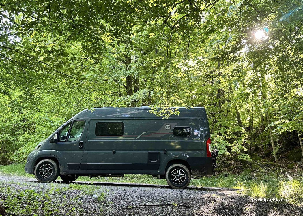 un endroit vraiment isolé dans la forêt. A ccès délicat, mais parfait pour un petit van. Pas besoin de mettre les cales. nous avons passé une nuit au calme total malgré la petite route qui passe au-dessus. superbe vue en montant à l'antenne.