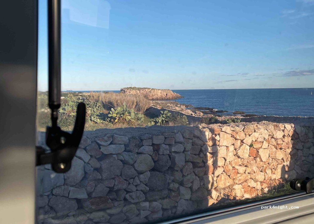 Un parcheggio con una splendida vista sul mare. Questo posto si trova proprio sul mare. C'è un muro di pietra che impedisce di accedere direttamente agli scogli. È possibile raggiungerli tramite un passaggio. Molti pescatori parcheggiano qui le loro auto per andare a pescare. Ci sono bagni Dixi che vengono puliti e svuotati anche la domenica. C'è un punto di rifornimento d'acqua nelle vicinanze.