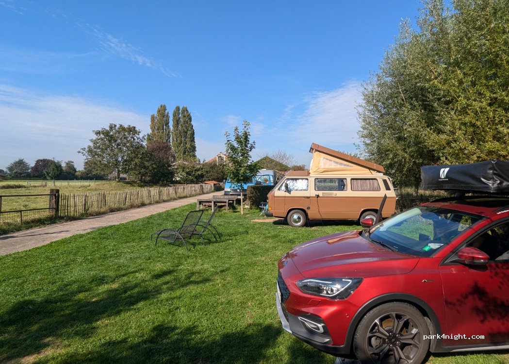 Vraiment du camping à la ferme ! Fortement recommandé pour ceux qui recherchent la paix. Les grands camping-cars (max 5m) ou caravanes (max 5,50m) ne sont pas les bienvenus. Non pas que les propriétaires ne les aiment pas, mais il n'y a tout simplement pas assez de place pour cela. Donc, pour ceux qui rentrent dans les dimensions maximales, fortement recommandé !! Nous avons dormi en face du pâturage des moutons. Notre fille a pu admirer les ânes et les poussins nouveau-nés. Une seule toilette et vous prenez une douche dans l'ancienne fosse à lait !