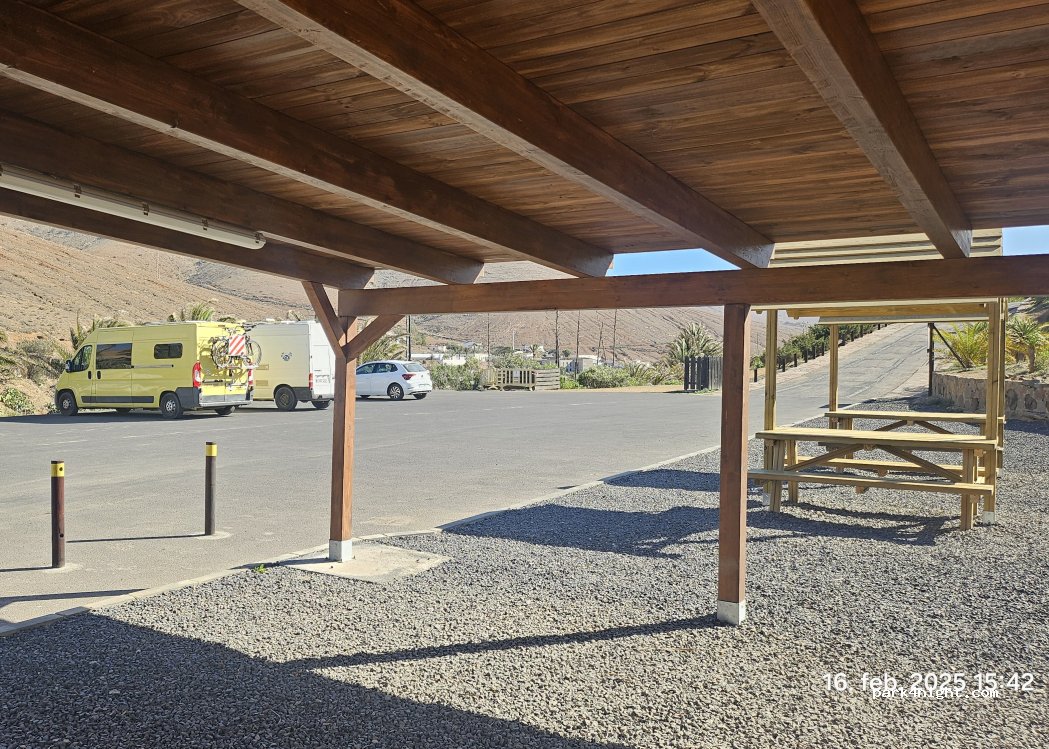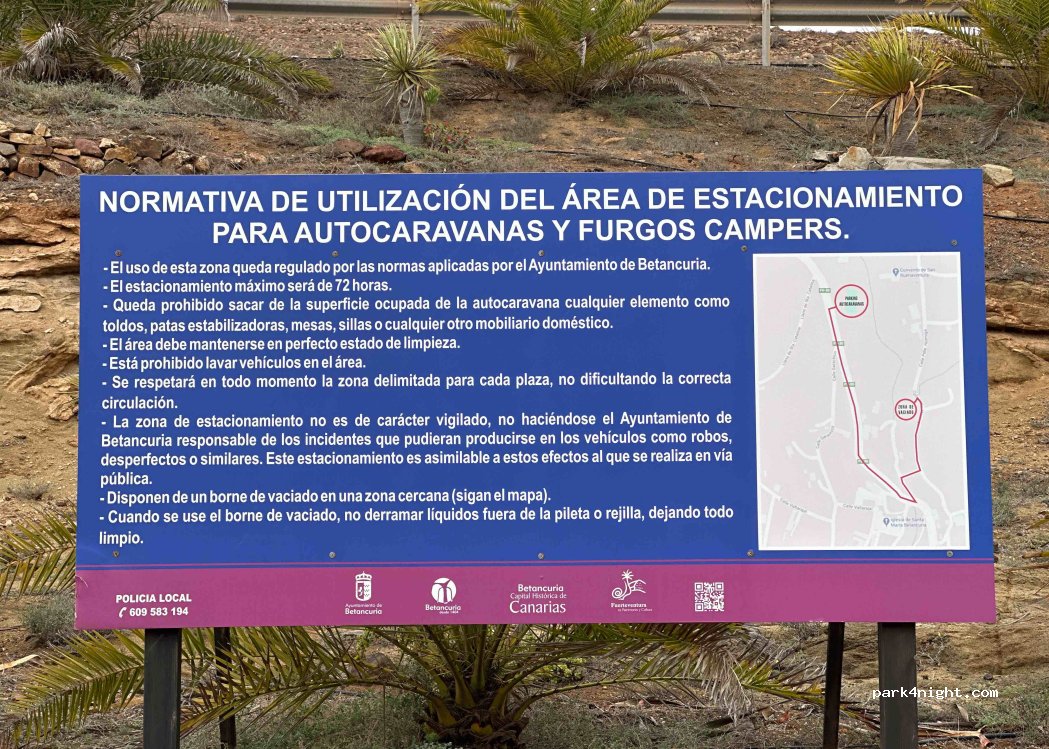 Hay que agradecer al Ayuntamiento de Betancuria que se haya acordado de las autocaravanas y tengan hasta una toma de corriente de 220 voltios, aunque solamente tenga la autonomía de la instalación de placas solares que alimentan unas baterías. Lo único malo que tiene es de la inexistencia en sus alrededores de zona de cambio de aguas. Hay que irse a otro lado del pueblo.Pero por lo demás gracias