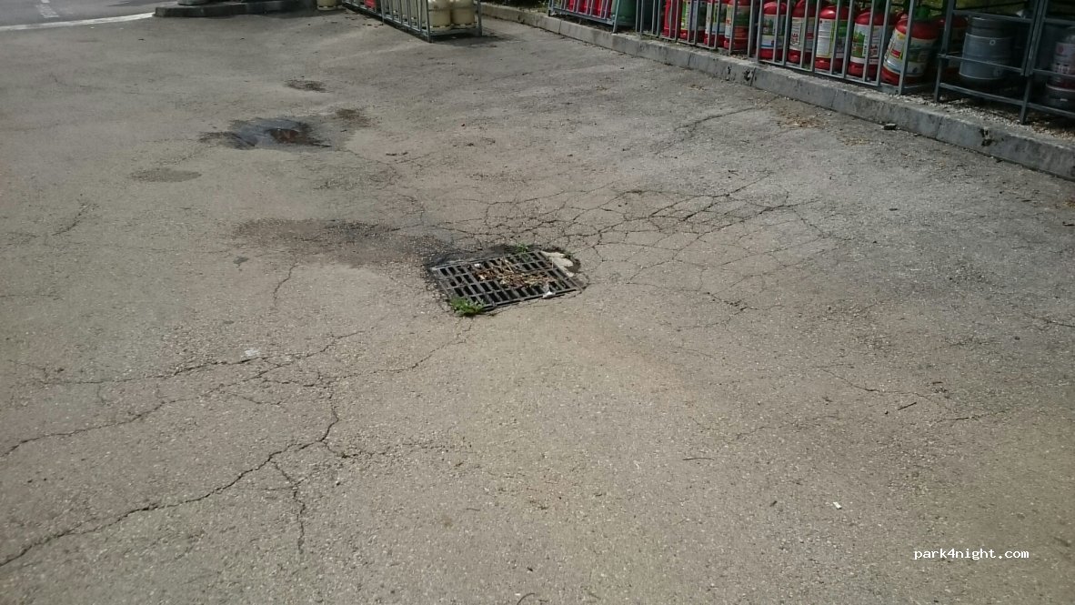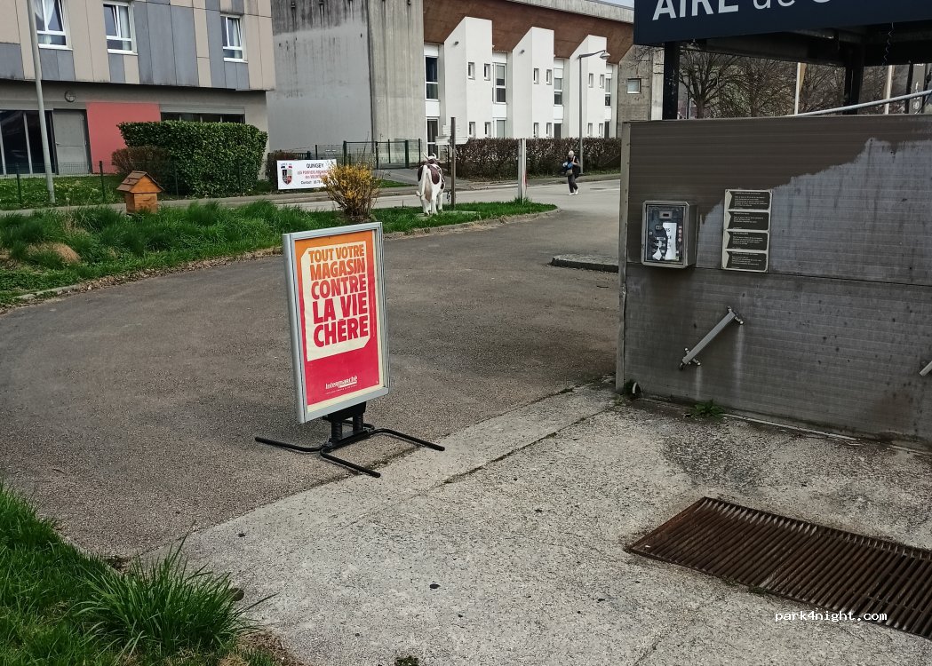 Trois places réservées aux camping-cars. Elles étaient libres toutes les trois. Si le parking du super marché est bondé, il est évident que des voitures stationnent sur ces places. Eau par monnayeur. Vidange WC Pour les eaux grises le faire au seau et non pas sur la grille de la station de lavage.