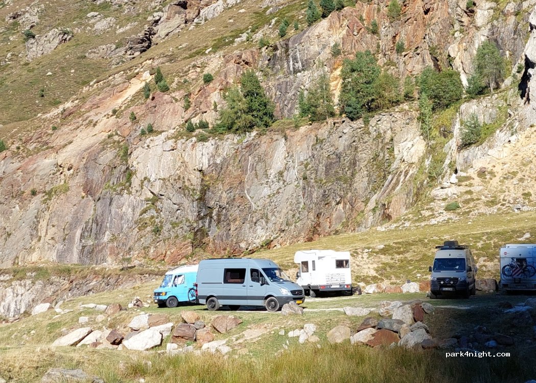 Zeer uitzonderlijke plaats met prachtige uitzichten en wandelingen , wel stevige schoenen en voldoende water meenemen , ongerepte natuur met water en bergen en stuwdam , wel klimwerk met de mobilhome nog 1 uur klimmen vanuit auzat maar zeker te moeite om te doen , wel drukke plaats bezet door Fransen , geen water , wc en elektriciteit , echt een een aanrader voor 1 of 2 nachten