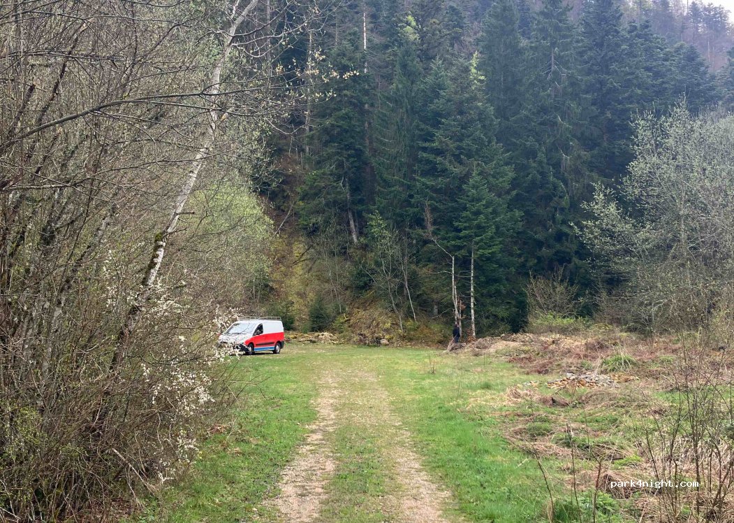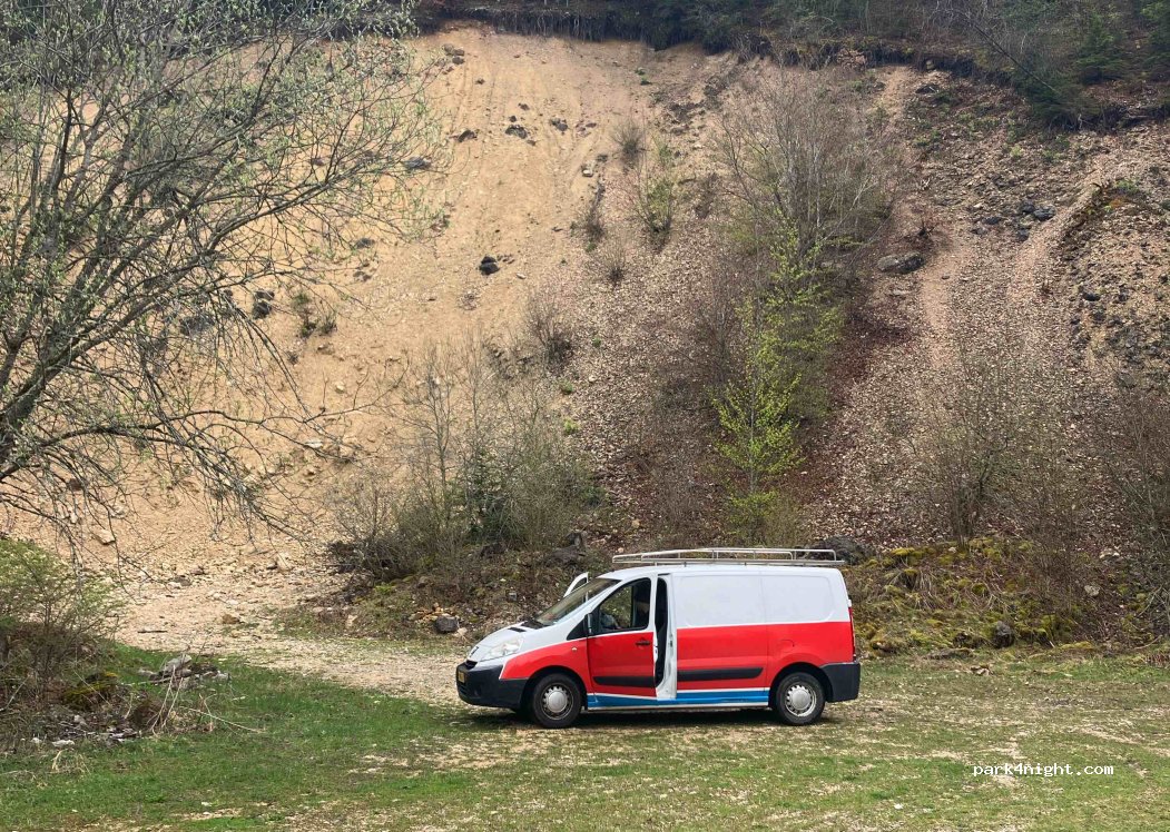 Chemin enpierré d'accès facile (je pense que la photo ne correspond pas), très grand espace (nous étions 2 vans mais possible pour 4 sans se serrer), à l'ombre jusqu'à 10h30 en été. Se méfier peut-être des éboulis possibles au fond de la place.