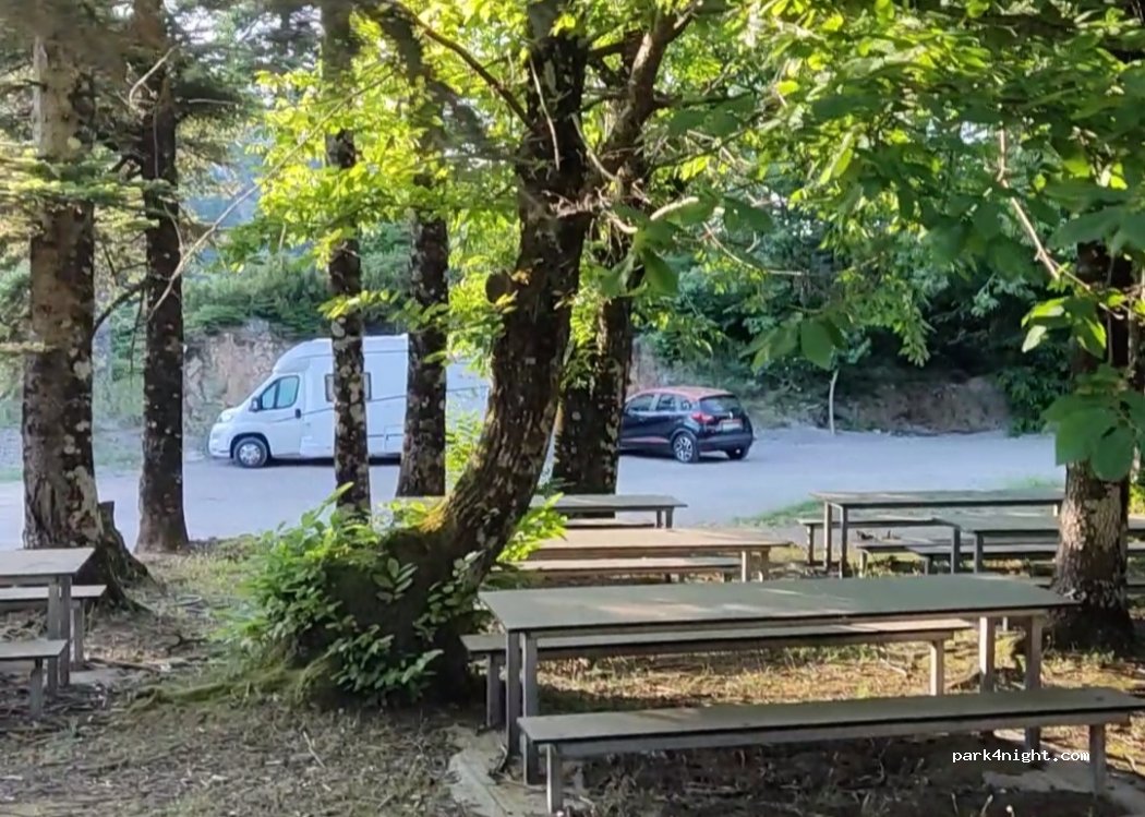 Petit parking de la nouvelle chapelle. Plusieurs tables pour pique-niquer. L'endroit n'est pas fou mais il a le mérite d'être à l'ombre. Nous avons passé une nuit très calme ici après avoir randonné sur le mont dirfi.