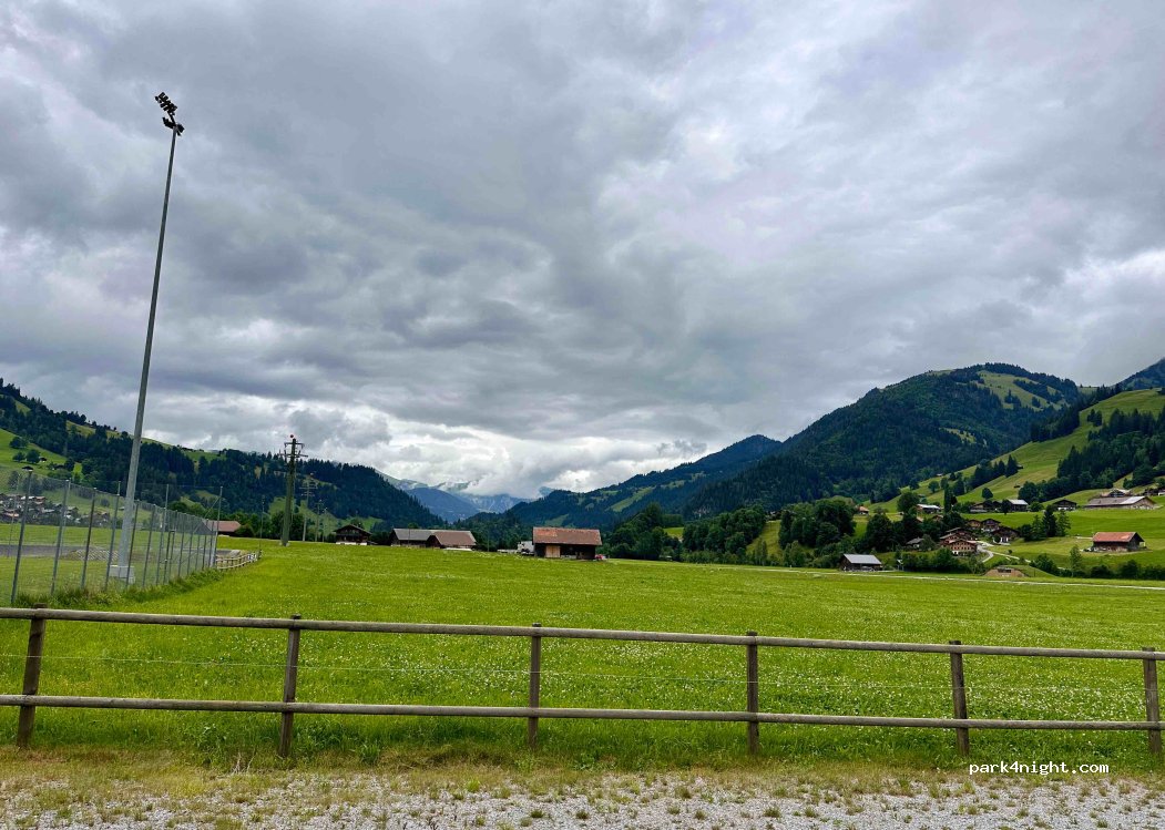 The village's central parking lot is about a 5-minute walk away. The Fire Department Magazine, a large, newer building on the street, is called "Simmental Arena." It's best to park behind the building as there's a large parking lot there. Parking is permitted, but camping (chairs, tables, awnings, etc.) is prohibited: a fine of CHF 200 will be imposed.