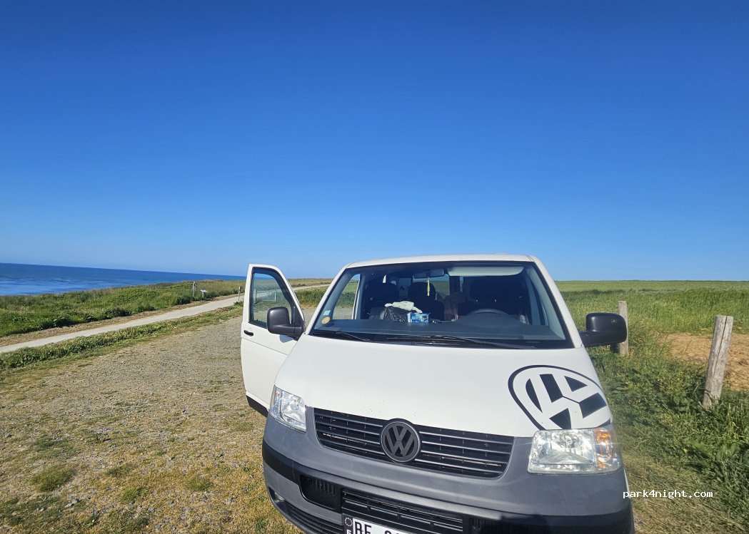 Sitio apto solo para furgonetas, ya que hay limitación de 2 metros de altura. El terreno está inclinado. Las vistas son espectaculares, a primera línea para la puesta de sol y muy tranquilo. Hemos estado solo 2 furgonetas por la noche. Pegado a un camino que lleva a La Pointe Du Hoc.