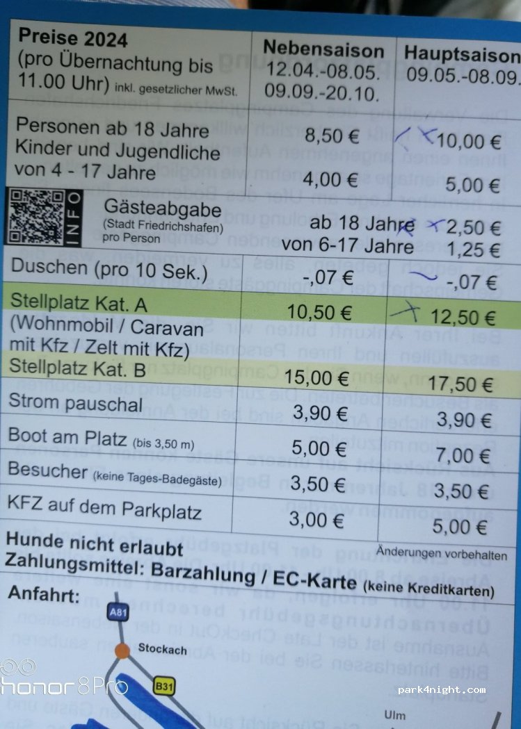 Auf die Öffnungs- und Ruhezeiten wird streng geachdet. Z.B. Mittag 12:00 - 14:00 keine Einfahrt, keine Ausfahrt, Fahrten auf Platz generell untersagt, Empfang nicht besetzt. Muss man bei der Planung einrechnen. Mit Fahrrad in 15 Min in Immenstaad, in 30 Min in Meersburg. Schöne Velostrecke. Einkaufstipp: Kaufland am Stadtrand von Friedrichshafen. Auch günstigster Sprit in der Region.