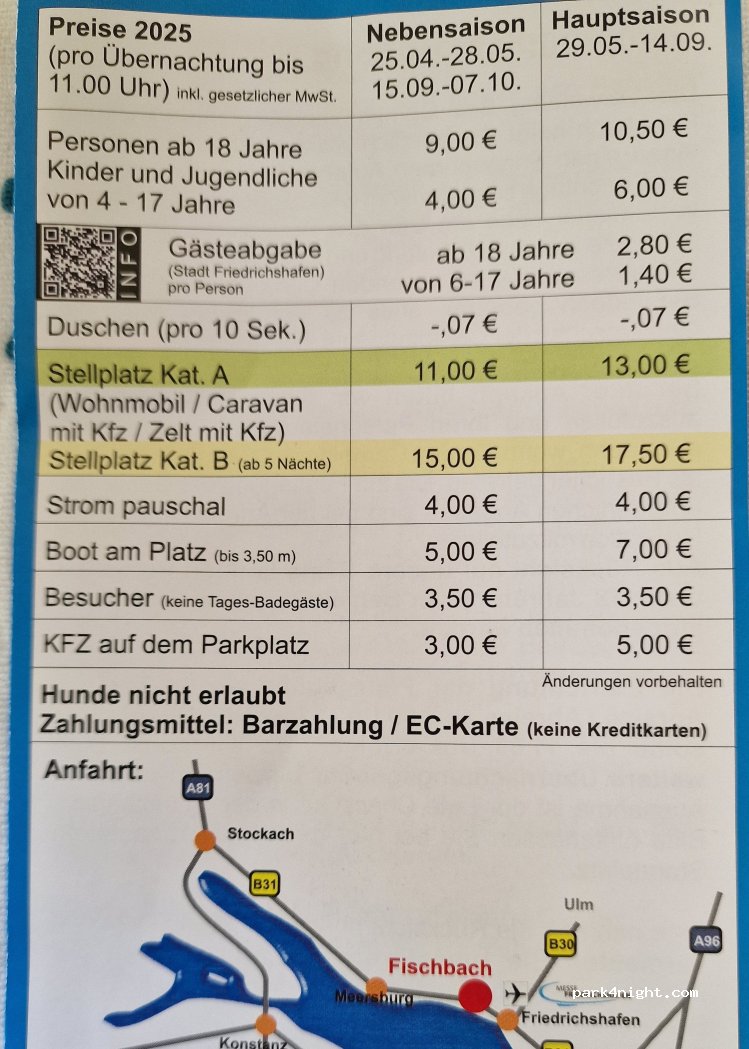 Camping Friedrichshafen Fischbach. Reasonable price for a lakeside location. Very clean sanitary facilities. Flat pitches but a little tight for motorhomes of 7 m. Not very far from Friedrichshafen (zeppelin airship museum), which you can reach by cycle paths. Dogs not allowed.
