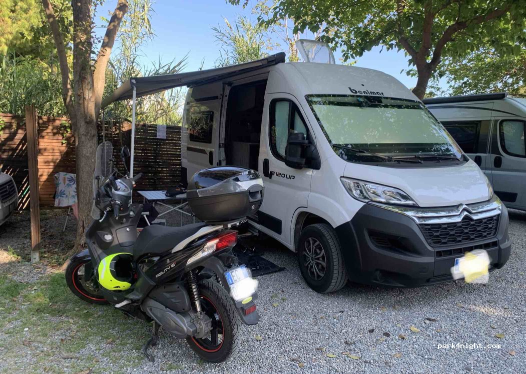 One of the most random sites we have been to. Parking is along the fence line around several white houses. No room for an awning as we’re next to driveway. Male and female facilities are next to each other as is the chemical toilet and the washing up area. 10minute walk to beach and restaurant, while takeaway and Conad are about 300m. 40€ for low season.