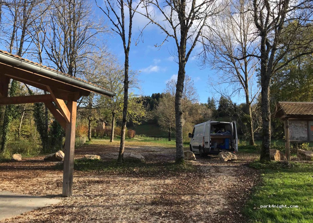 I found this place because there is already a referenced point on the other side of the pond. Large gravel parking lot. I preferred this side of the pond which is quieter (further from the departmental road), a little more "intimate" and the view of the pond is better. Towards the entrance to the car park, almost at the corner of the gites, going up very slightly towards the church, there is a toilet with a sink and a tap which you can easily fill a jerry can. The height is not limited and the parking lot is large (easy to maneuver), the access road is however not very wide. Around the pond there are picnic tables. For fishing it is necessary to inquire because it is necessary to take a card. Departure of walks / hikes. Some nice stops nearby: - Point of view of the cross of Evosges - Cascade de la Bruire (unmarked path)