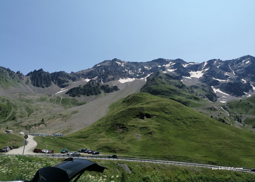 Theres parking spot galore around here! take your pick of amazing views.then oak! toilets available, some drops and cafes open depenendant on time of year. Great stop after doing the Col de Galibier.
