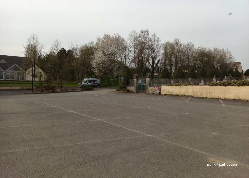 Sehr schöner Parkplatz vor dem kleinen Friedhof. Nebenan ein Spielplatz, Boulebahn und Grünfläche an einem Bach, Picknicktische, Müllcontainer. Sehr gut als Zwischenstopp für autarke Fahrzeuge.