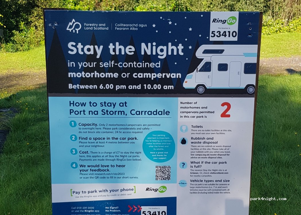 Small forestry car park. Signs say only 2 allowed. Difficult to park if larger than campervan. We were alone and tucked into far right corner slightly on bank. 6.7m long. Only picnic benches no facilities. Very quiet night. Great walk up hill overlooking Arran. Short walk down to Carradale harbour.