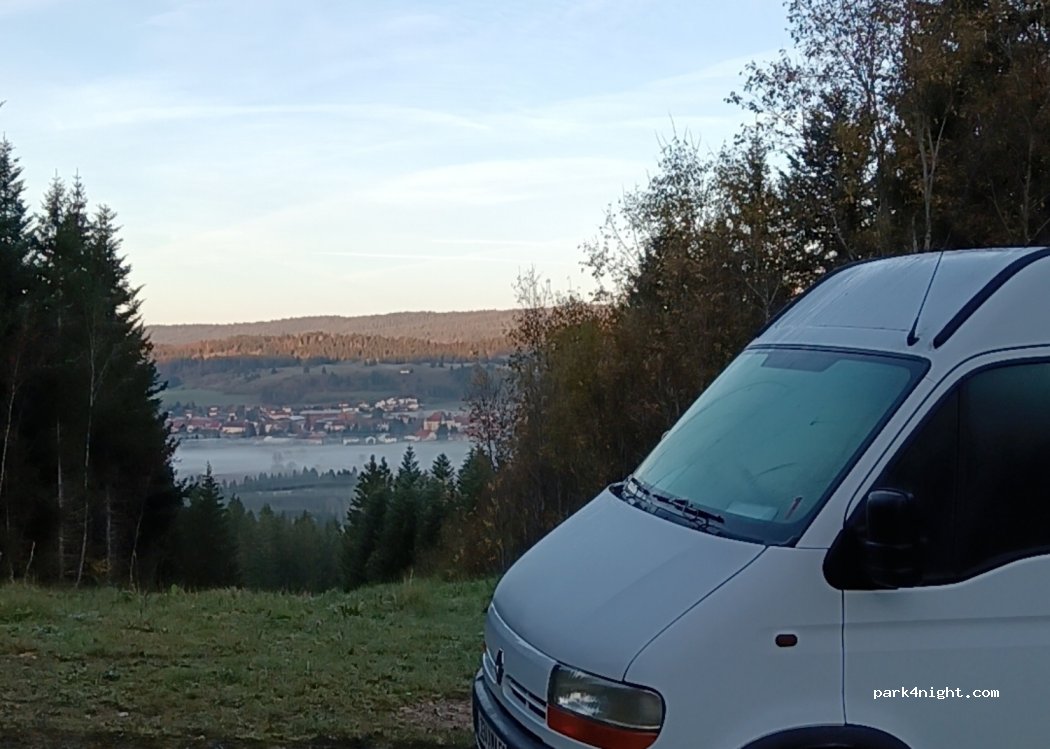 Emplacement boueux par temps humide. Un véhicule de 6m pourrait presque s'installer sans cales. Pas de problème d'accès à cette période. La petite vue sur la ville de Mouthe est sympa