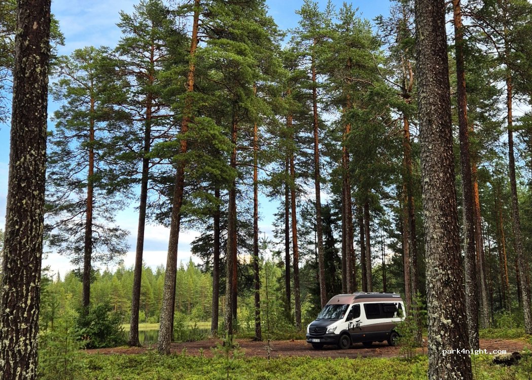 Wir waren von dem Platz sehr begeistert. Die Straße war wenig befahren, die vorbei fahrenden Autos stören null. Man steht mitten in einem Kiefernwald, Heidelbeeren etc rundherum und direkt am See. Kostenlos und nur für autark Stehende.
