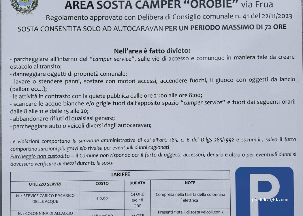 Nueva zona de aparcamiento para autocaravanas del Ayuntamiento de Ardesio con 11 plazas para autocaravanas. Situado a la entrada del pueblo en una zona tranquila, cerca del río Serio, rodeado de vegetación. Dispone de columnas para conexión eléctrica, espacio de servicio para autocaravanas equipado con desagüe para recogida de residuos y toma de carga de agua. Área iluminada. Aparcamiento y electricidad de pago, servicio de autocaravanas gratuito. Tarifas en página web.