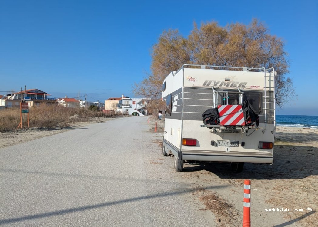 Spiaggia sabbiosa, acqua cristallina, durante il giorno molti frequentatori della spiaggia ufficiale, la sera molto tranquilla, poche vere taverne greche all'interno della cittadina, è stato possibile pernottare anche lì, la polizia è venuta a fare la strada più sicura, magari in anni normali senza CV non è possibile pernottare qui. Anche in gennaio c'è acqua.