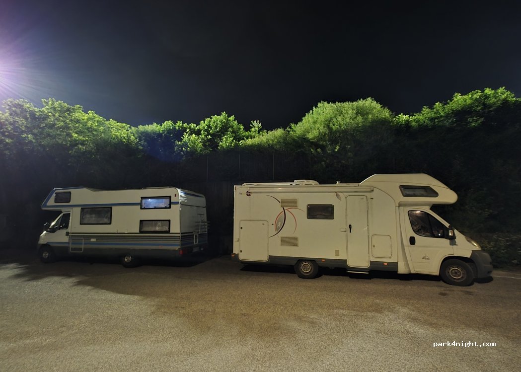 Ad agosto 2025 abbiamo parcheggiato macchina con roulotte (14,5 m di lunghezza) comodamente per una notte. Molto comodo perche vicino alla frontiera.