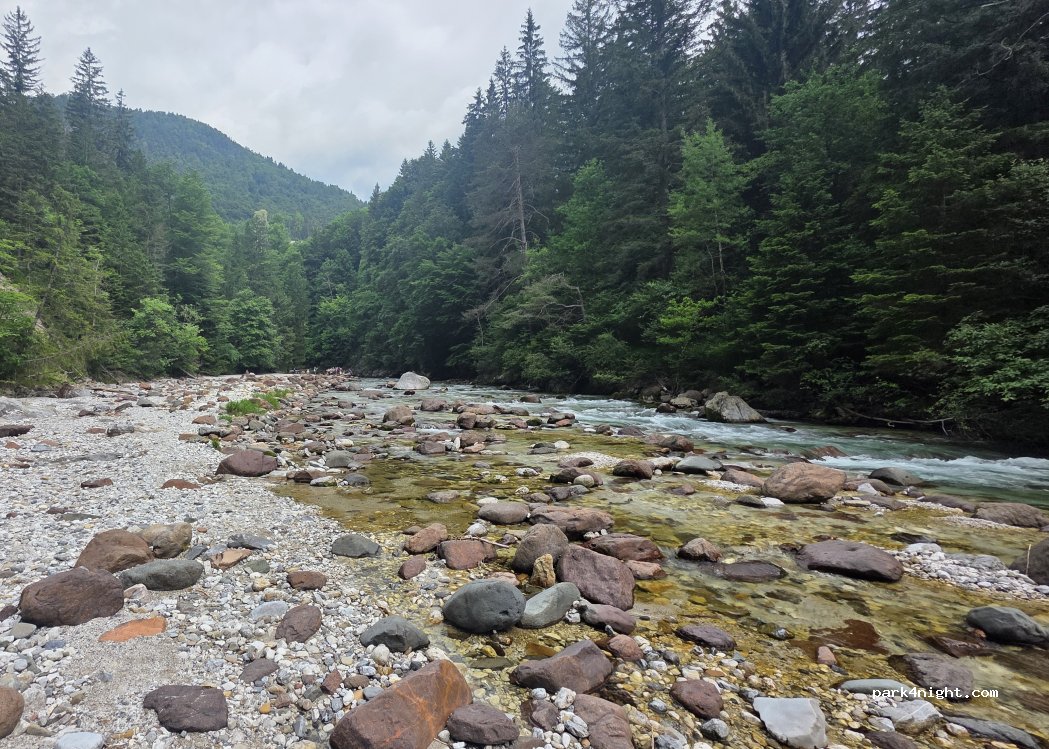 Parcheggio senza divieti per AC. Perfetto per fare l'Orrido dello slizza, il sentiero che attraversa il fiume. Molto tranquillo e immerso nella natura.