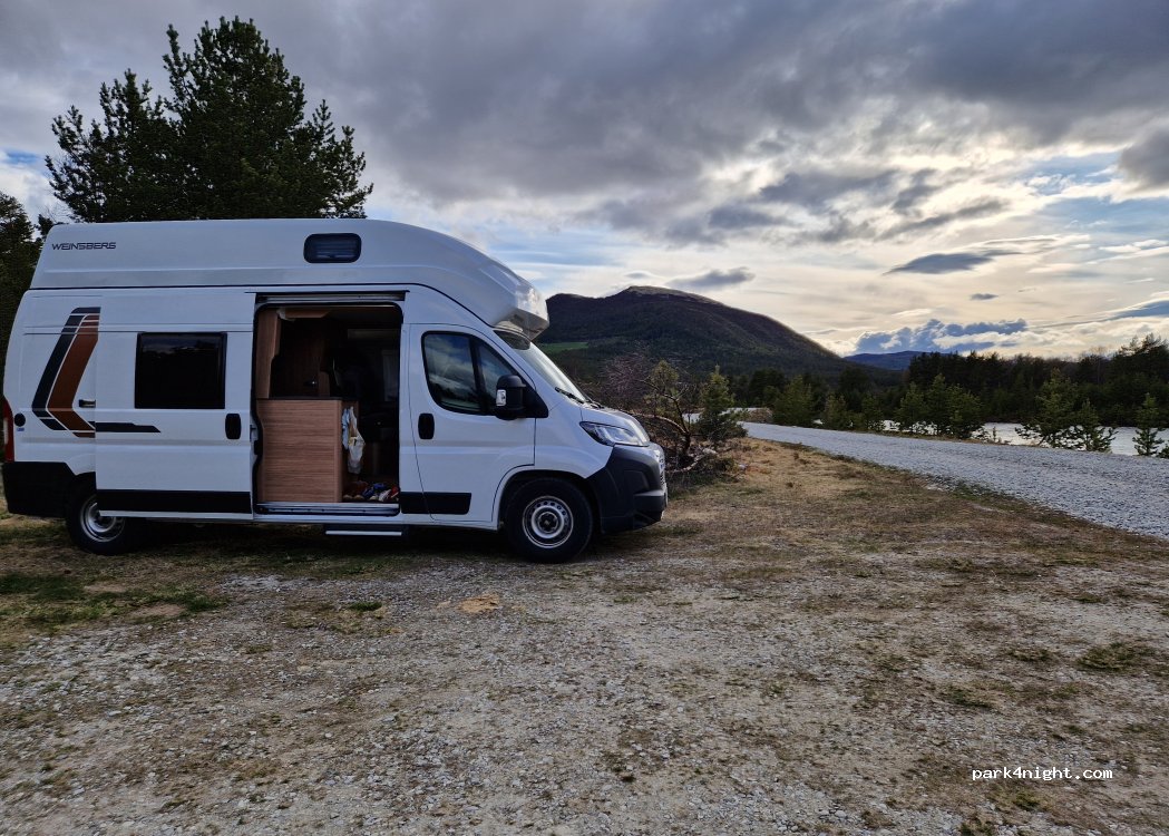 Nuit tranquille passée ici. Nous étions 2 camping-car de plus de 7 mètres garés pour la nuit. En retrait de la route juste assez pour ne pas être gênés :-) Passage d'un agriculteur avec son tracteur, sur le chemin qui longe la rivière. Il nous a salué avec un grand sourire :-) Merci la Norvège et les Norvégiens pour votre accueil ♡