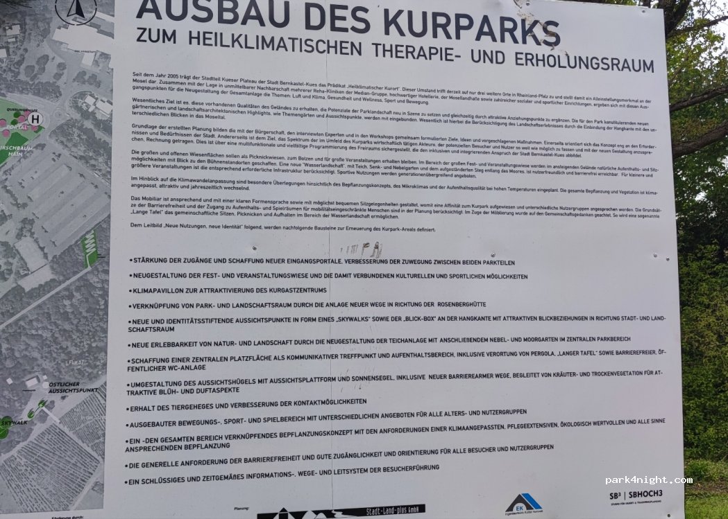 Ein Parkplatz, Nachts sehr hell beleuchtet. Optimal für einen Besuch bei den Reha Kliniken Patienten. Der Kurpark wird gerade massiv aufgewertet. Sehr schöne Wanderwege mir Aussicht auf die Mosel Schleife und Bernkastel - Kues. Stand hier an 2 Wochendenden im April ohne Jemanden zu stören.