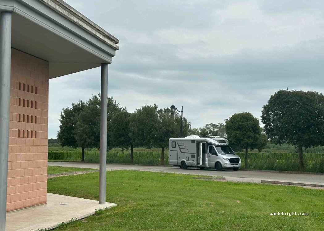 Sind über Nacht nach Italien gefahren und wollten von 7-ca 11 vormittags schlafen. Der Parkplatz ist sehr ruhig, steht auch nirgends dass man nicht campen darf. Allerdings keine Klos, Duschen, Wasserhahn mit Trinkwasser o.ä. Ist einfach ein banaler Parkplatz