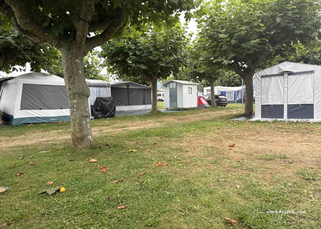 An area with large, demarcated spaces with drinking water and electricity in each space. It features hot showers (also for transit users), restrooms, a Wi-Fi zone, free bike rentals, electric scooter rentals, a swimming pool, a barbecue grill, a picnic area, a playground, daily bread and pastries, and a laundry area with a washing machine and dryer.