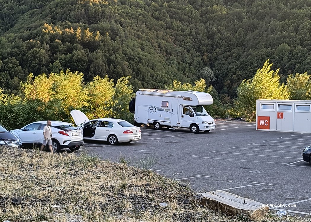 Great stop for overnighting very close to the border crossing. Level tarmac car park. Even though right near the main road for us it was very quiet overnight . Great view down the valley . Supermarket very well stocked.