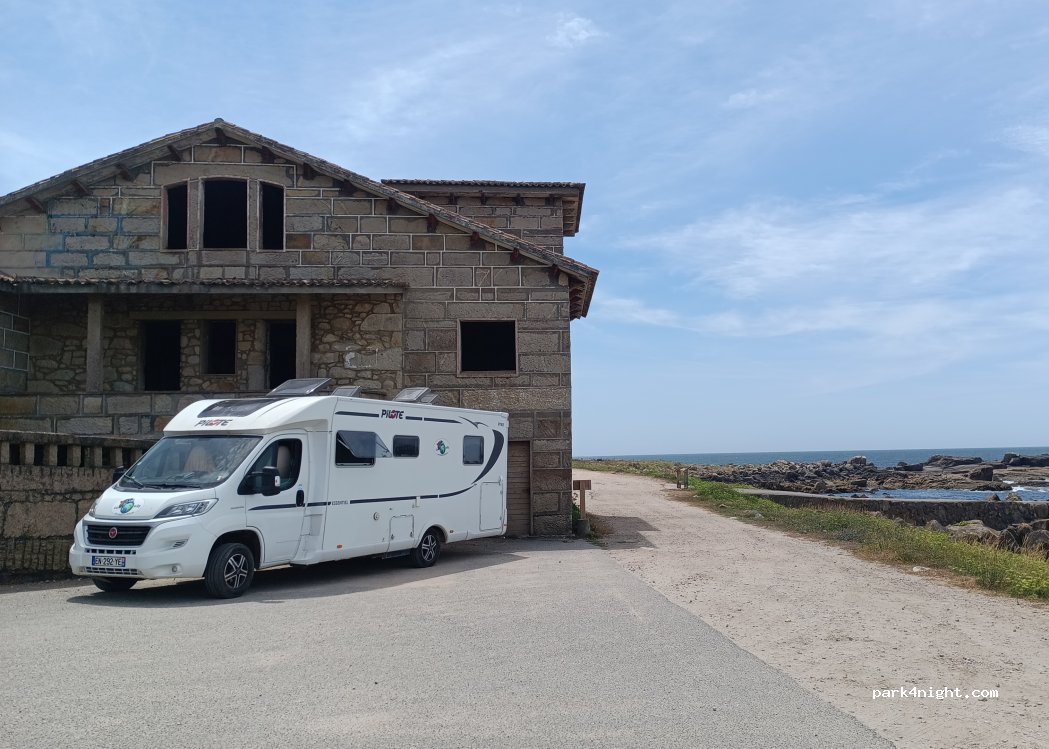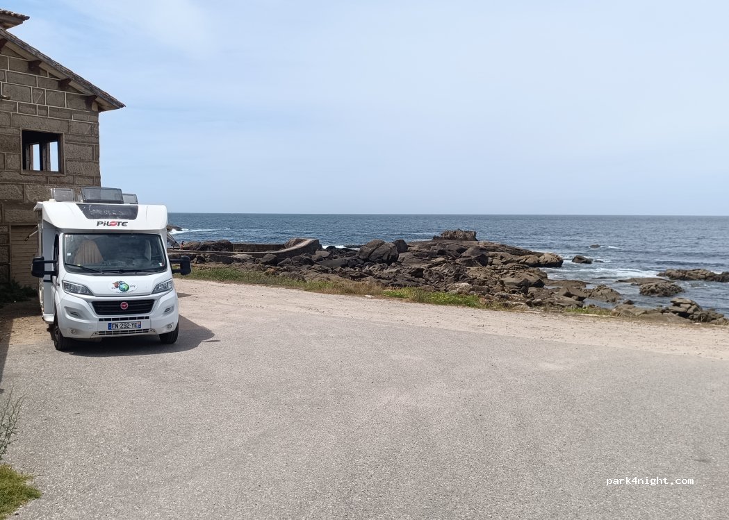 Superbe, très belle vue sur la mer et les rochers. Nous avons assisté à un beau coucher de soleil et passé une bonne nuit bercés par le bruit des vagues.Nous étions seuls pour la nuit, il n'y a de la place que pour 2CC. Passage des pèlerins de Compostelle du camino portugais.
