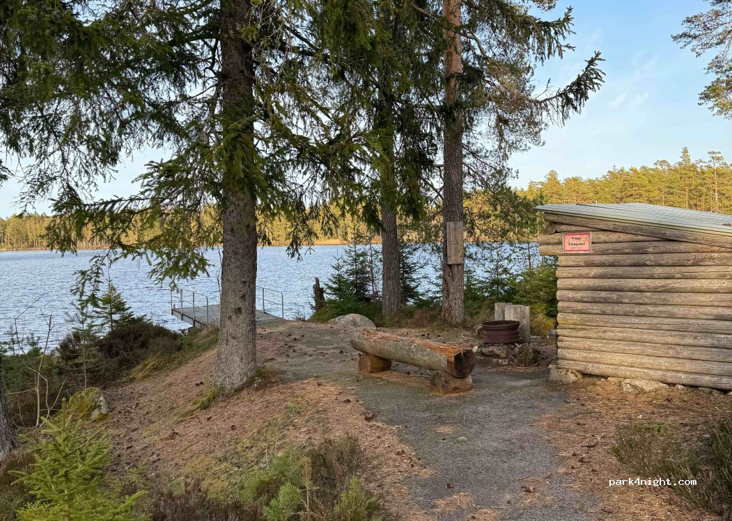 Ein Parkplatz am Ende eines Waldweges direkt am See gelegen. Es gibt eine kleine Hütte zum Schutz vor Wind und Wetter und eine Feuerstelle. Angeln verboten.