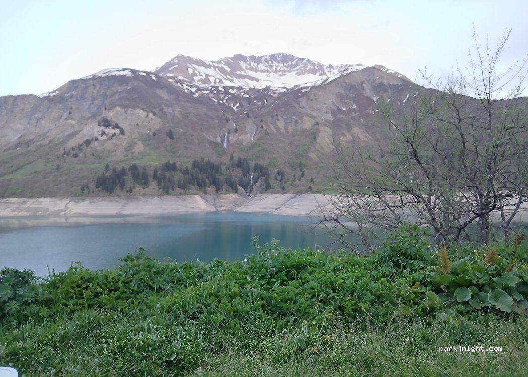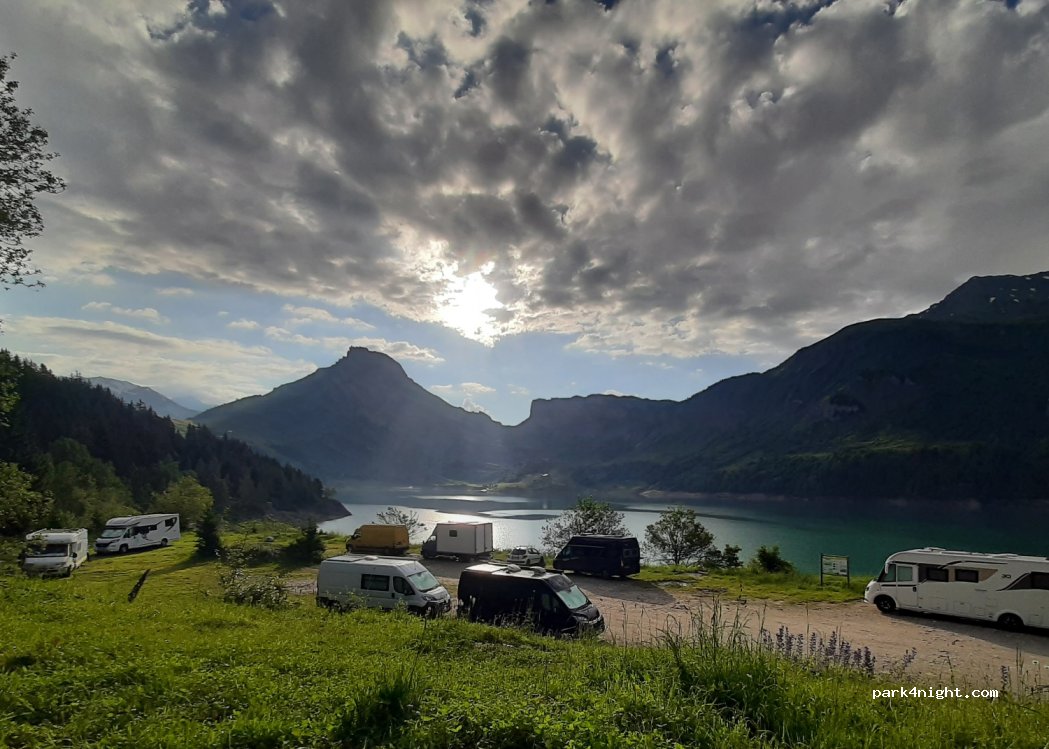 Super panorama. Nuit très calme malgré le nombre important de camping-car. Attention baignade interdite ainsi que les sports nautiques. La pêche est autorisée avec permis pêche obligatoire à retirer à l'office du Tourisme de Beaufort (13 euros la journée)