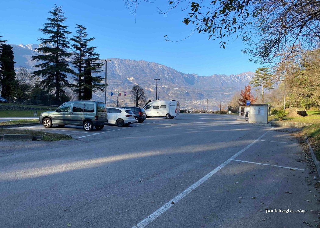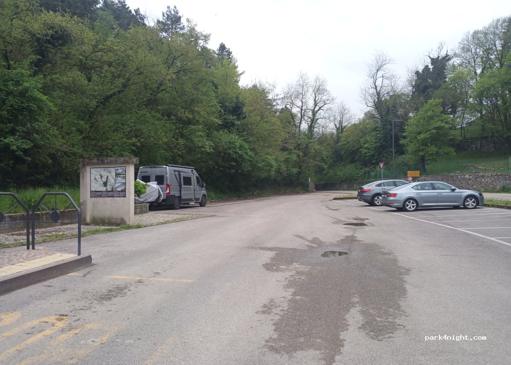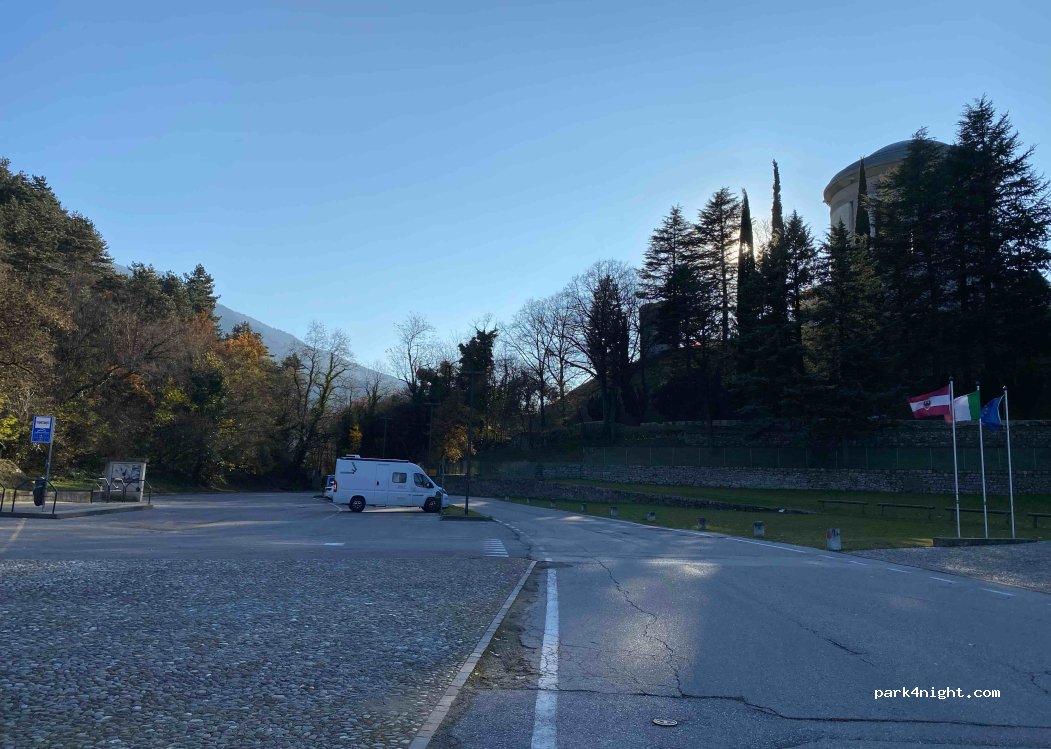 parcheggio senza delimitazione in zona molto tranquilla di fronte al sacrario dei caduti. ampio e con buone possibilità di manovra. senza limiti orari. possibile pernottamento: nessun divieto al riguardo