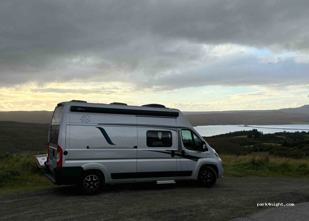 We had a nice, very quiet night here. In good weather you should have a nice scenic view over the Kyle of Tongue. We were unfortunately here on a cloudy night. The parking is next to a very quiet road, especially during the night. There is space for about 3 campers.