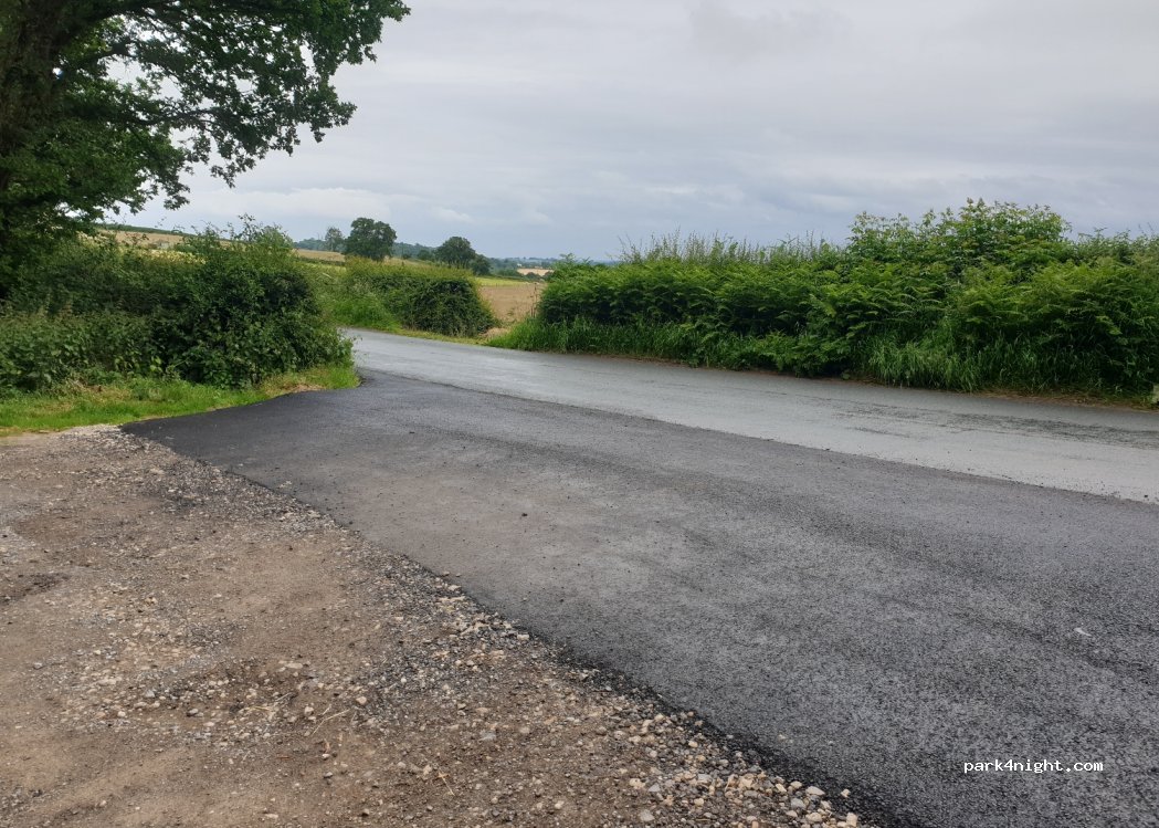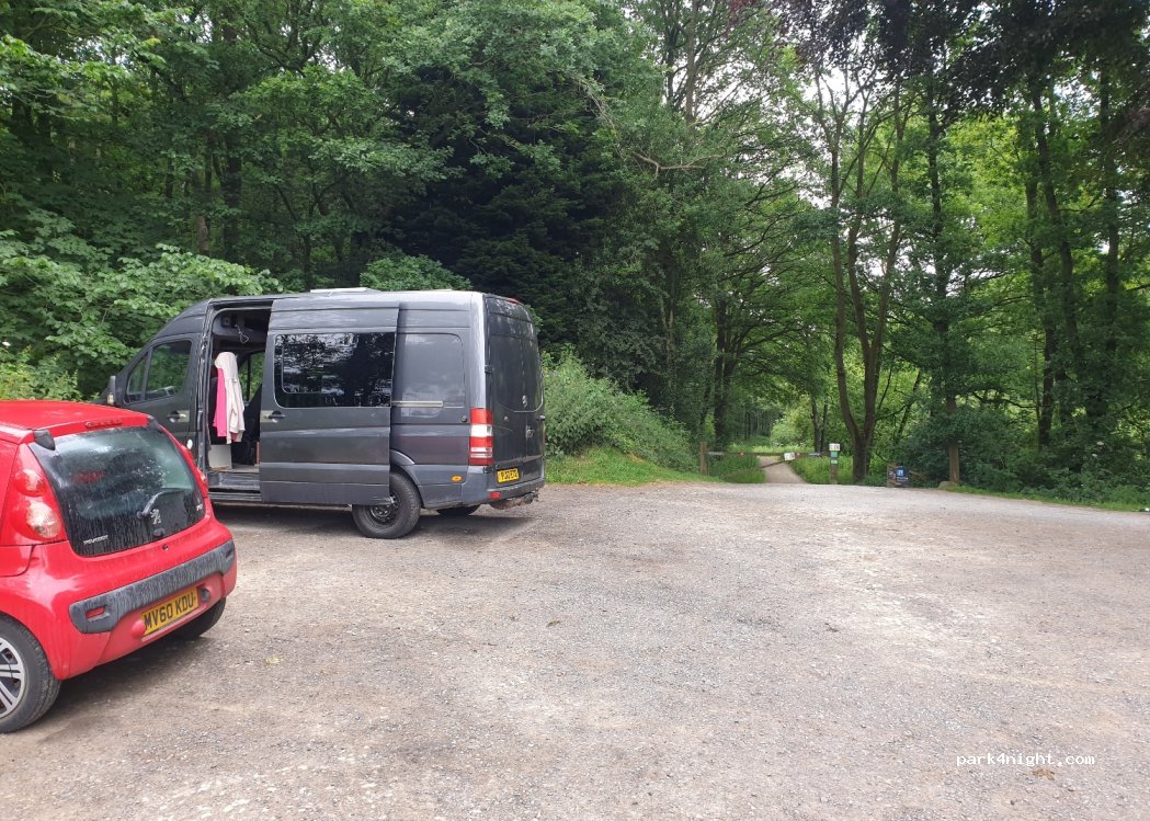 Free small car park next to a lovely large woodland with public footpath. Fairly level but we still used chooks. Arrived at 9:30pm and no one else around. Also on a quiet road and barley any through traffic. Great spot!