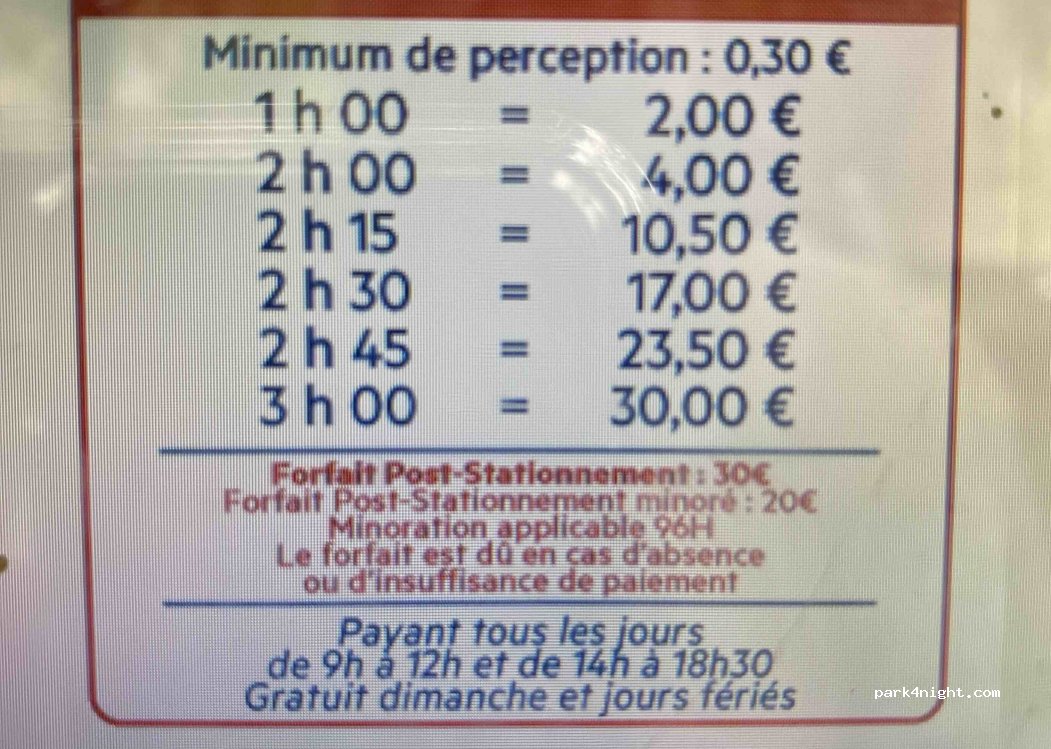 In the center of Tours parking under the trees behind the large church. Boulangerie around the corner. paid parking until 9 a.m. to 6.30 p.m