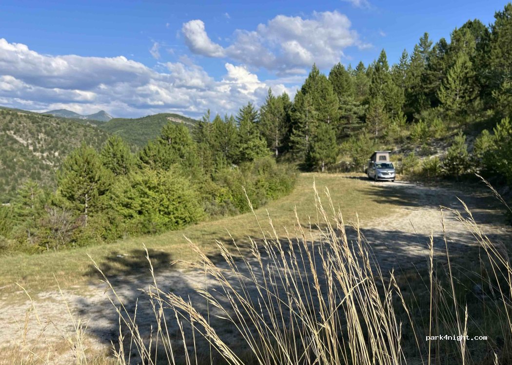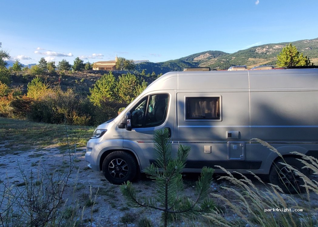Le point gps renseigné localise la chapelle alors que le parking pour s'installer se situe de l'autre côté de la piste d'accès. Très bon spot, grand espace avec une belle vue, arbres à proximité, quelques passages de véhicules sur la piste d'accès pendant la soirée.