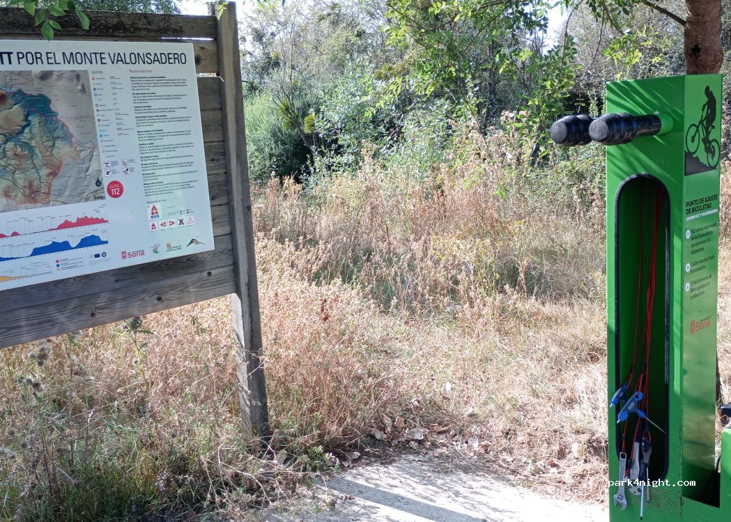 Muchas plazas amplias para aparcar y pernoctar. Tienen muy poquito desnivel. Gran zona con mesas de picnic y columpios. Hay papeleras y contenedores por todos los sitios. También hay fuentes. No hay más servicios. Muchas zonas para darte un paseíto y muchas rutas para bicicletas. El parking está en la misma carretera pero no es muy transitada por lo que es tranquilo y puedes descansar bien.