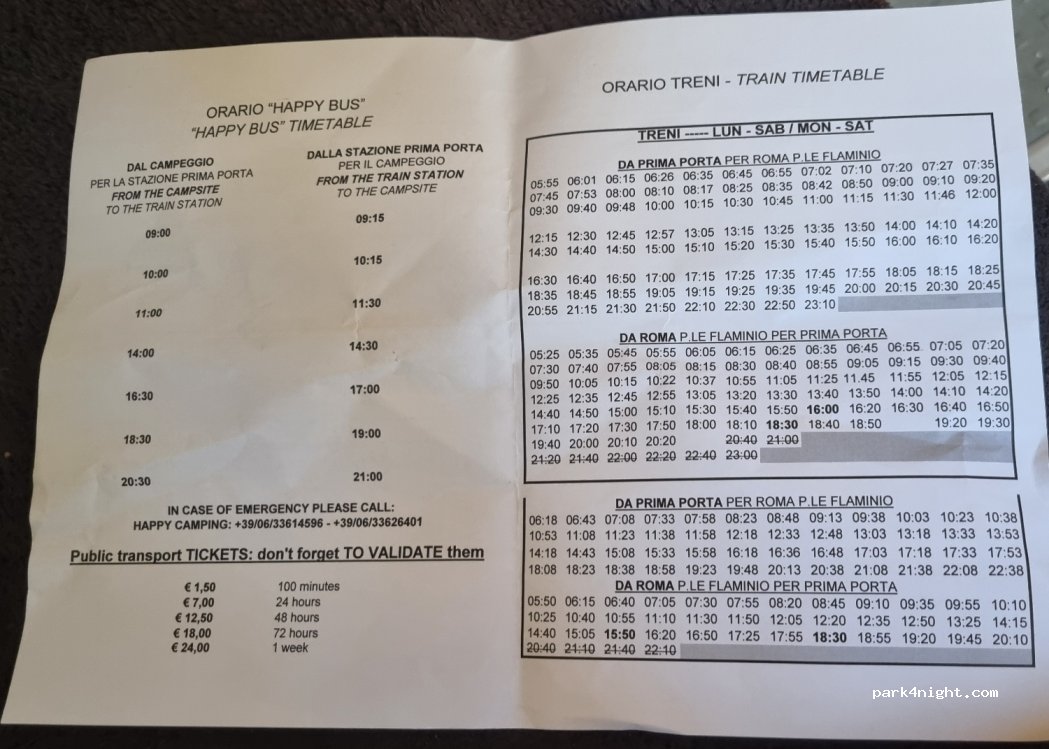 Happy Village Camping, ideale per visitare Roma. Navetta gratuita dal campeggio alla stazione del treno (ferrovia Roma-Viterbo) "Prima Porta". Treno diretto a Piazza del Popolo, ideale, al centro di Roma per visitare a piedi la città. La reception è molto carina, le lavatrici sono economiche, i sanitari sono puliti.