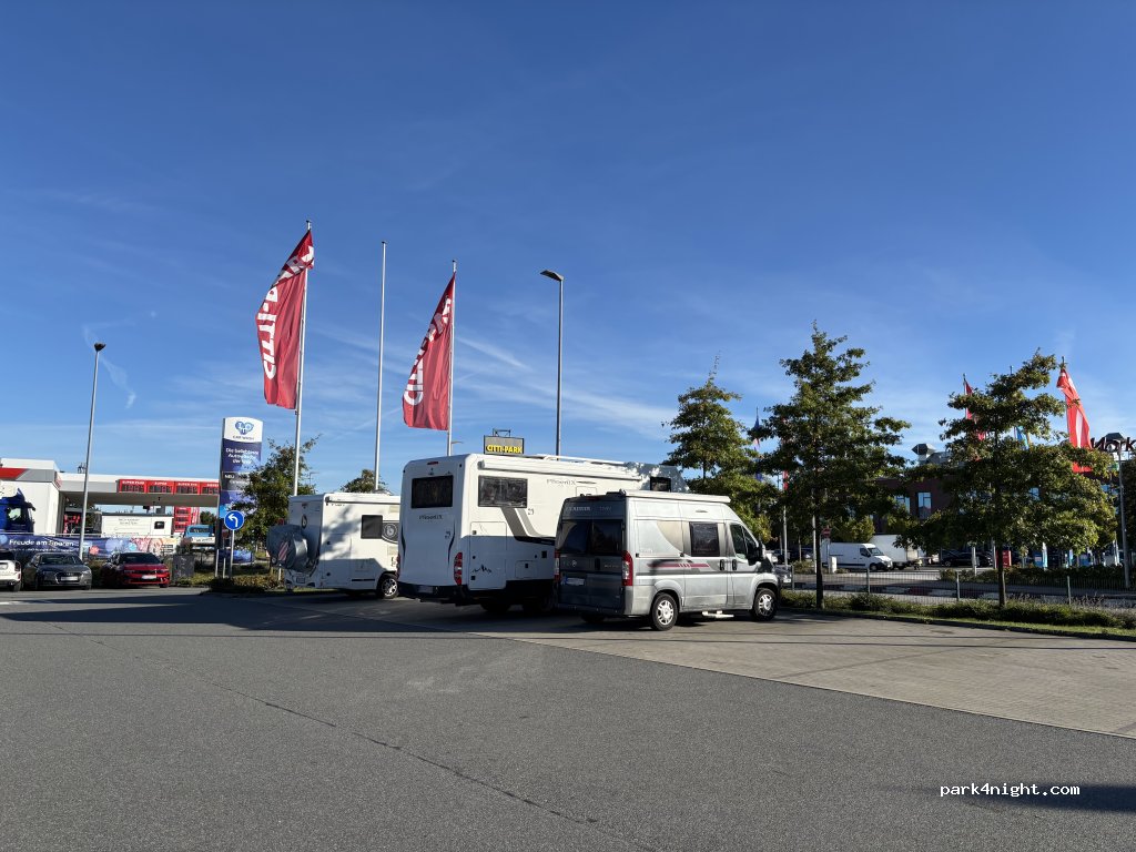 Grosser Parkplatz vor super Einkaufszentrum mit allem was man braucht. Beleuchtet. Bus Linie 11 nach Flensburg vor der Türe 2,30€ ein Fahrt. FLENSBURGER Brauerei Besichtigung ist empfehlenswert. Am nächsten Tag dann besser nicht fahren.