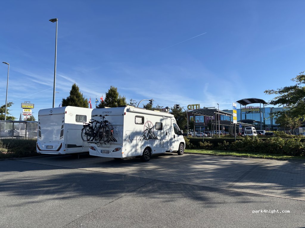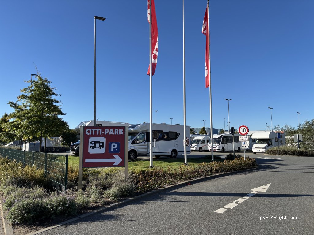 Er zijn gratis parkeerplaatsen voor campers vlak voor de hoofdingang van CITTI-PARK. De plaatsen zijn verhard en verlicht. Met gratis afvoerstation voor grijs en zwart water. Met een toevoerzuil voor vers water.