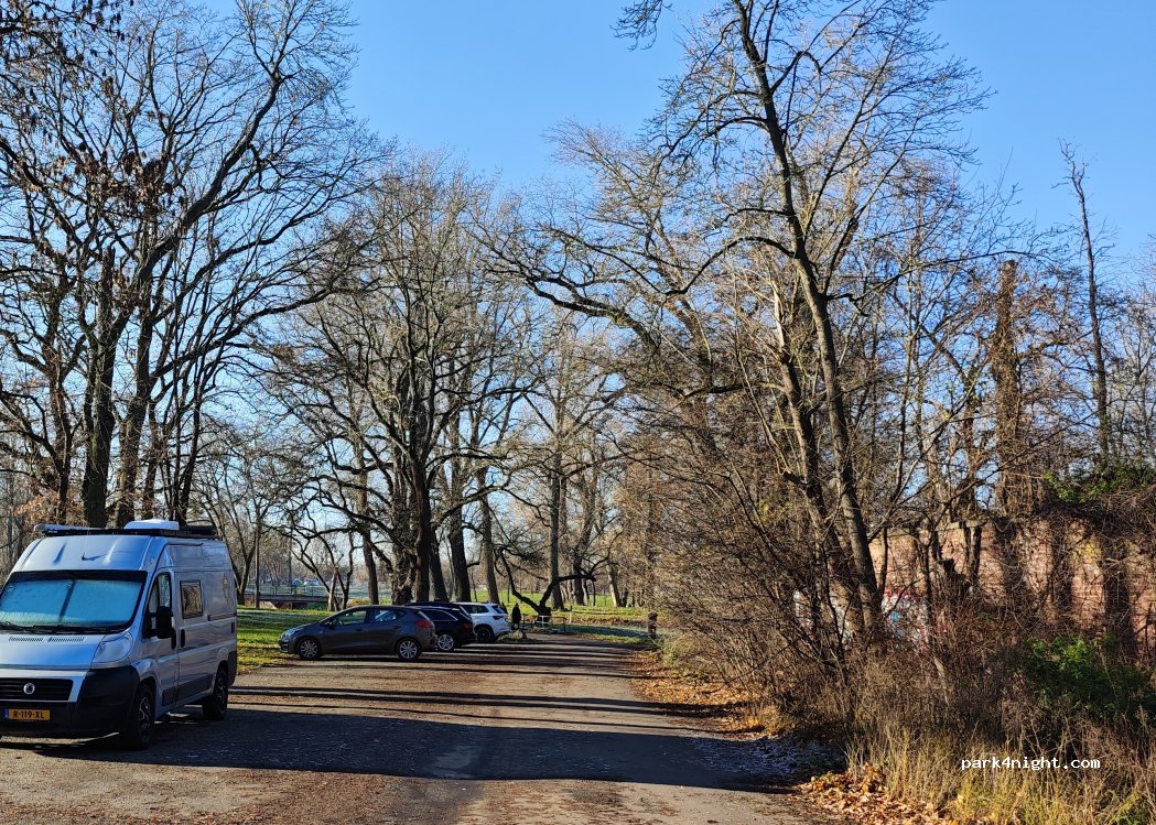 Schöner Parkplatz: Etwas Schatten, etwas Sonne, mitten im Park. Aber bitte blockiert nicht mehr als einen Stellplatz und stellt Stühle und Tische auf die Parkfläche. Neulich haben 3 Wohnmobile fast alle Parkplätze blockiert. Das ist nicht nur ärgerlich für Autofahrer, sondern führt schnell zum Verbot für Camper.