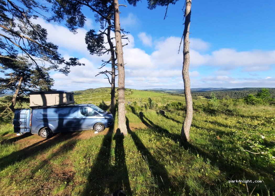 Panoramic view of the valley, just next to Aven Armand (visit to caves). Dirt track (30m) easily practicable, then arrival on a small space between the trees. Quiet place near a road with little traffic (off season). A little windy, but breathtaking view facing south. No 100% flat ground but acceptable level. L2H2 converted van passes without worries. No room for more than one vehicle at a time. Tip: engage in reverse to be in the right direction to exit.