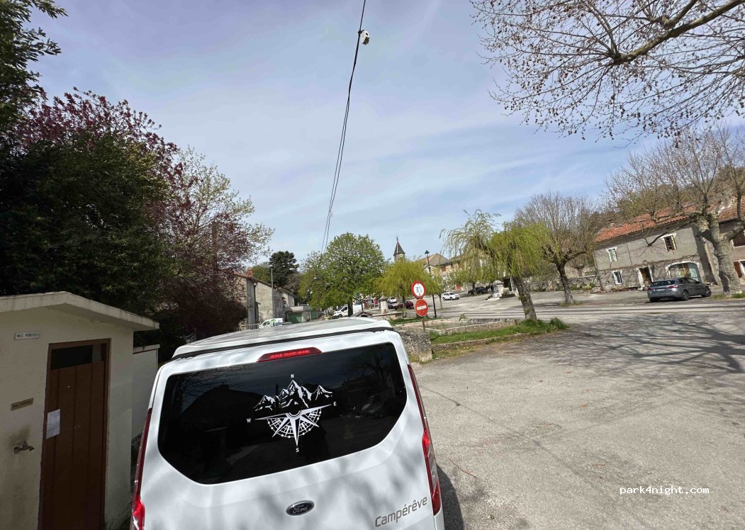Petit village avec simplement un robinet d'eau qui dépanne bien, plus des WC .. (donc, pas de vidange d'eau noir ou grise..) de quoi se garer à côté pour passer éventuellement une nuit .. *personnellement plutôt conseiller au petit camping car (-6m) et aux VanLife'urs ... endroit relativement calme .. gens sympas