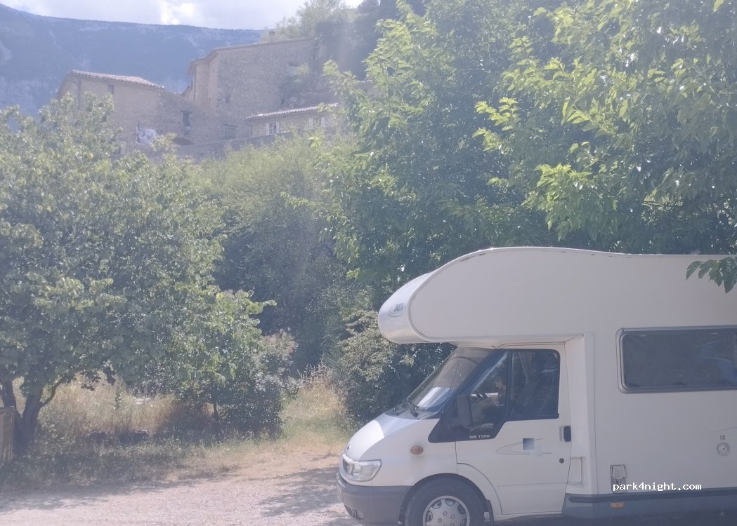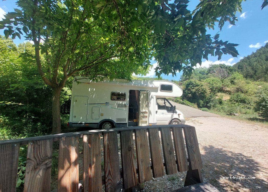 Il y a un parking sur l'herbe (avec une table de pique-nique) juste au-dessus de l'auberge (sur le haut du village en suivant la route). Je pense que la nuit est possible, mais il n'y a pas d'ombre l’après-midi.