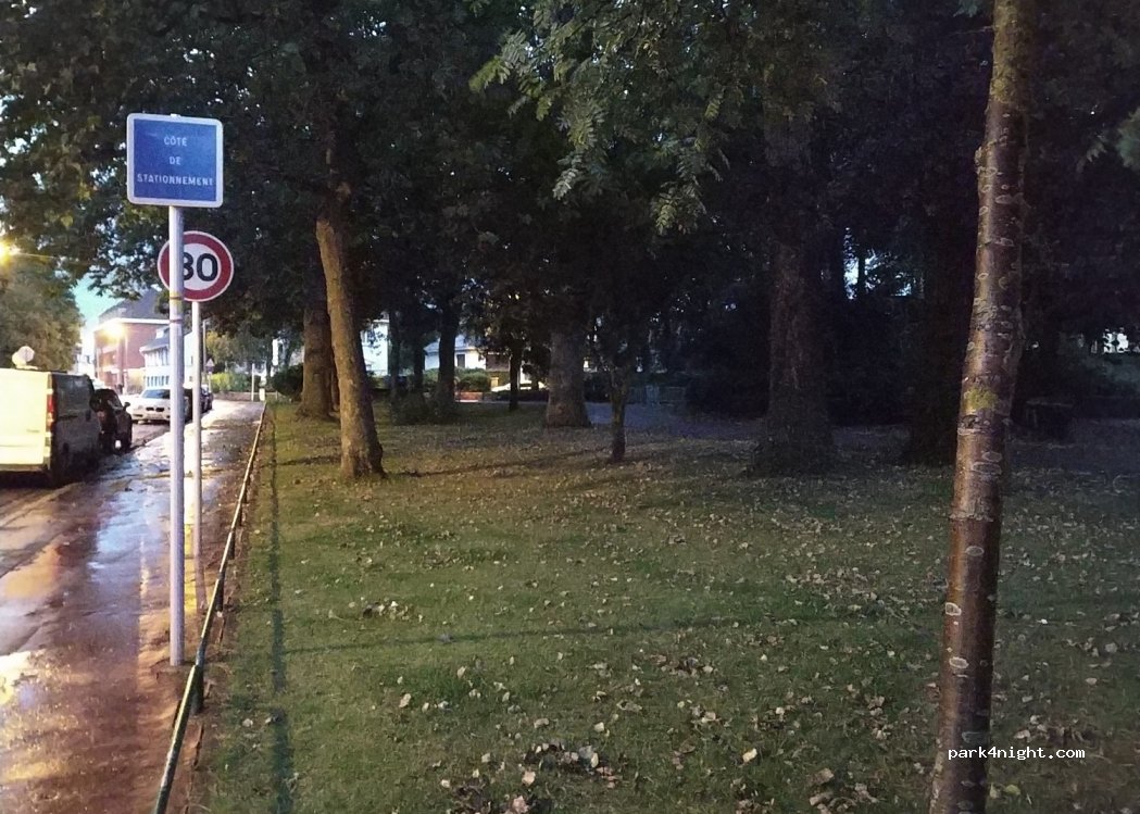 Free on street parking, close to the centre and shops. We were in a big RV so had to put 2 wheels on the path. The main downside was noise... Constant cars & bikes racing past, along with people stood talking throughout the night. We stayed Friday night & the town was busy, so bear that in mind. A good spot if you arrive off the Le Shuttle late at night like we did.