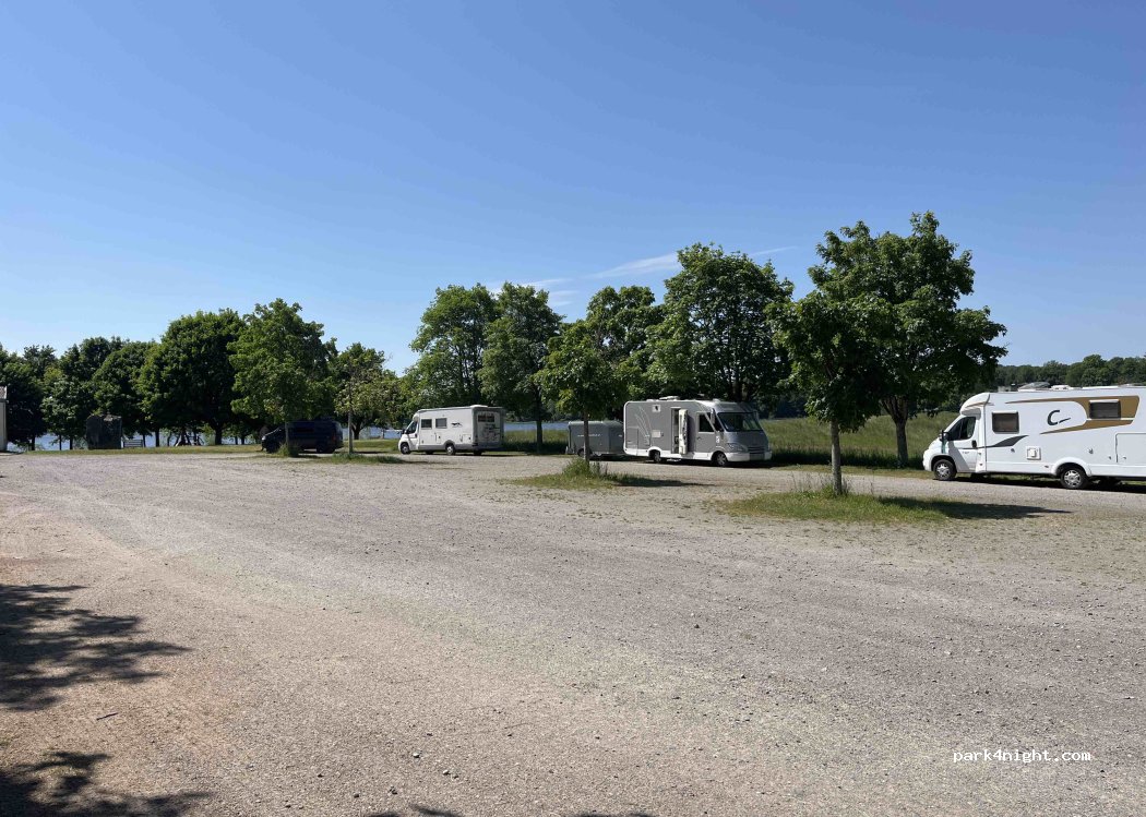 grand parking bien stabilisé. endroit calme possibilité de faire des balades à pied ou vélo. belle vue sur le lac. bien pour une pause repas l'aire de vidange est en pente dommage. Merci à la municipalité, dommage il manque une poubelle à verres ( les gens ne respectent pas !!!!en mettant les verres par terre)
