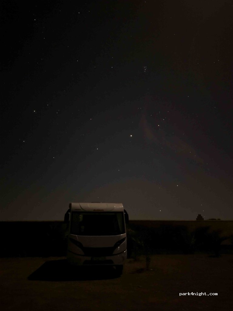 8.3m A class. 10/10. Wow, super camping, possibly best in Marruecos. 3km track from tarmac. Location perfect, in middle of nothing, flat, spacious parking. Excellent facilities with 10MAD water & easy waste dump, toilets/showers super clean. Very friendly welcome. Bread to buy in morning for 6MAD. Cous Cous in resturant muy rico, 80MAD. No noise at night whatsoever (no dogs and no prayer call).